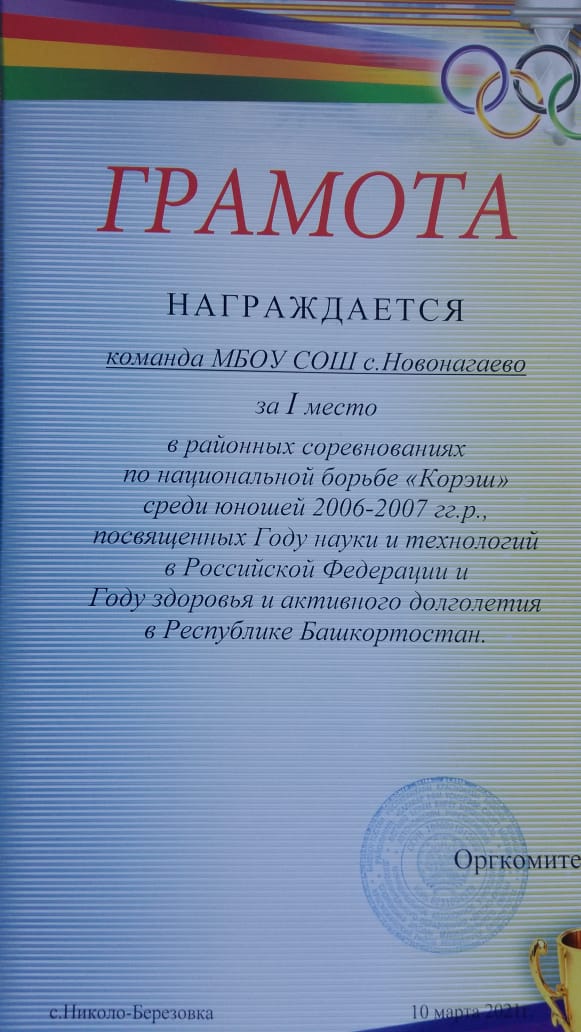 Сегодня, 10 марта, команда МБОУ СОШ с. Новонагаево заняла 1 место в районных соревнованиях по национальной борьбе "Корэш" среди юношей 2006-2007 г.г.р., посвящённых Году науки и технологий в Российской Федерации и Году здоровья и активного долголетия в Республике Башкортостан. Поздравляем ребят и тренера Гафура Ягафаровича Хафизова с победой и желаем новых спортивных побед!